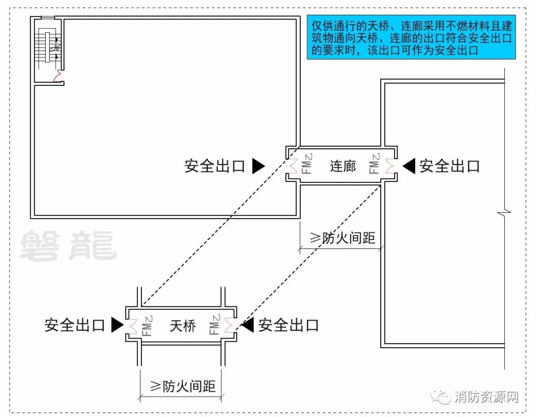 有顶棚的建筑和步行街等,其天桥连廊等均不能视为安全出口。