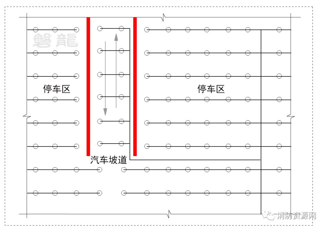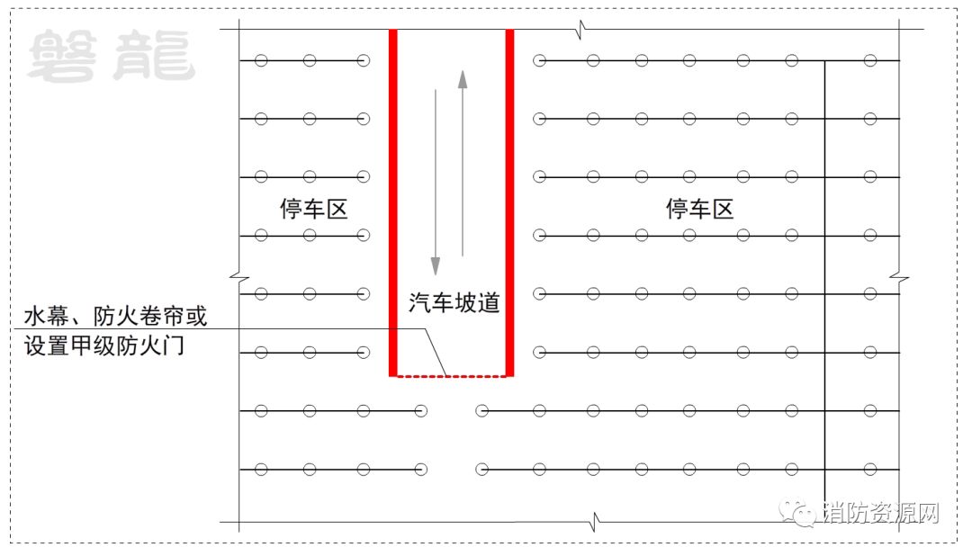 2、汽车坡道设置防火卷帘或防火门,并不是合适的处置方式,对于设置有自动灭火系统的汽车库,应尽量采用自动灭火系统保护汽车坡道的方式。