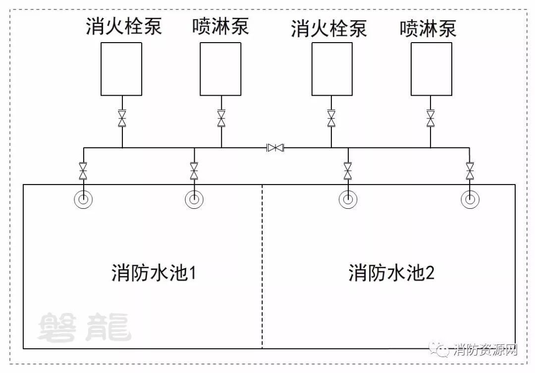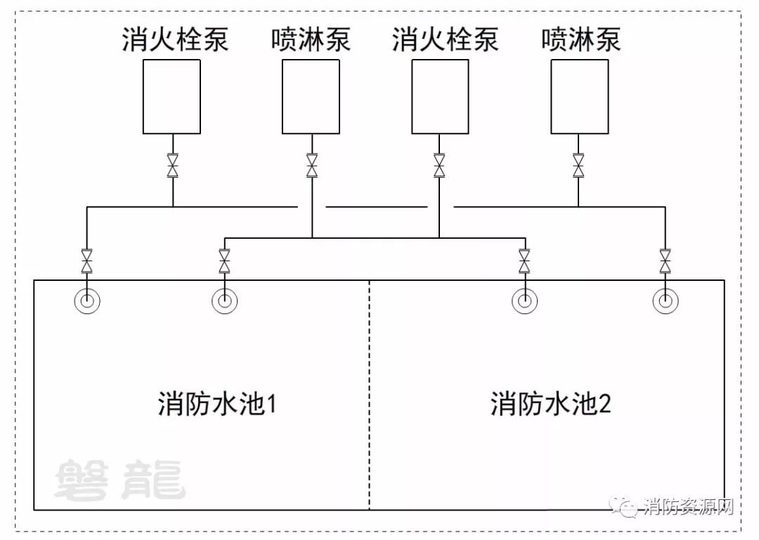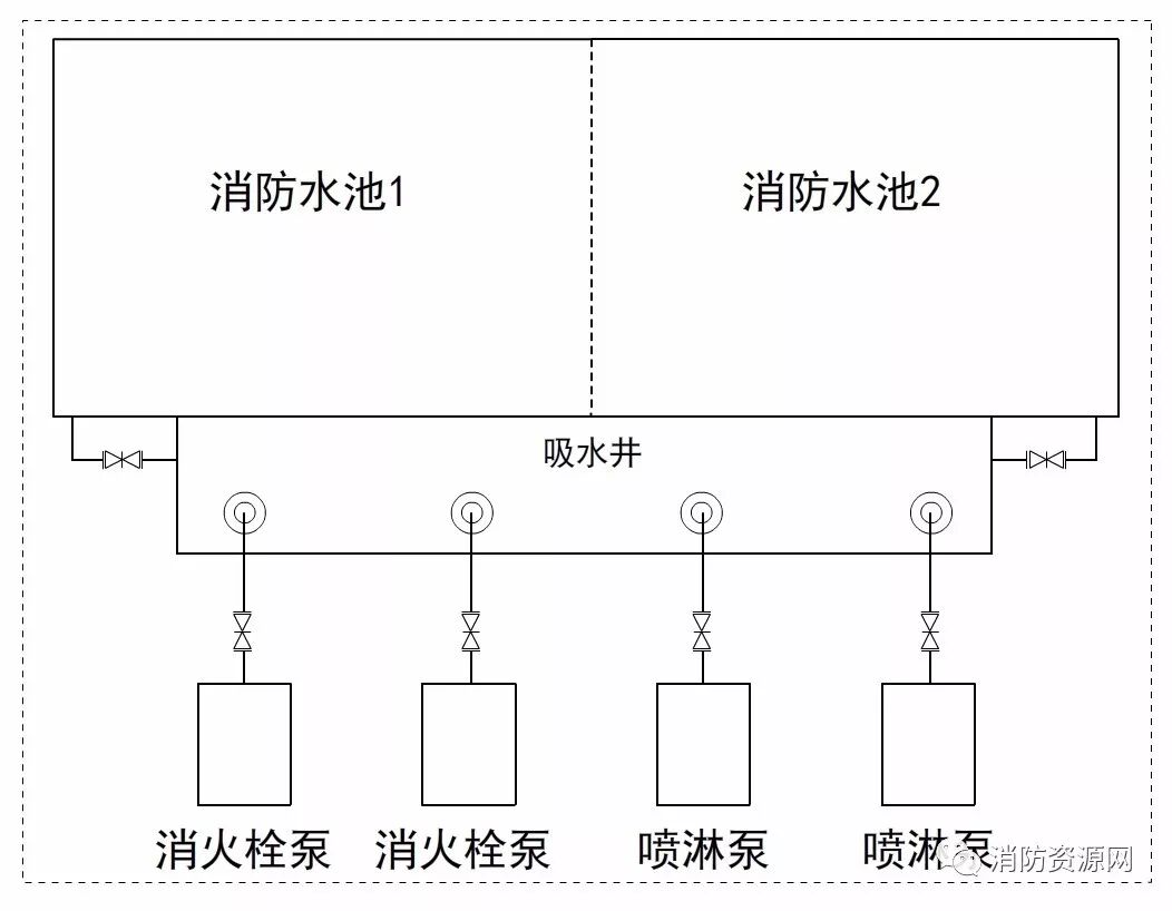 方案一:本方案为相对较好的方案,一个消防水池检修,不影响消防水泵吸水。