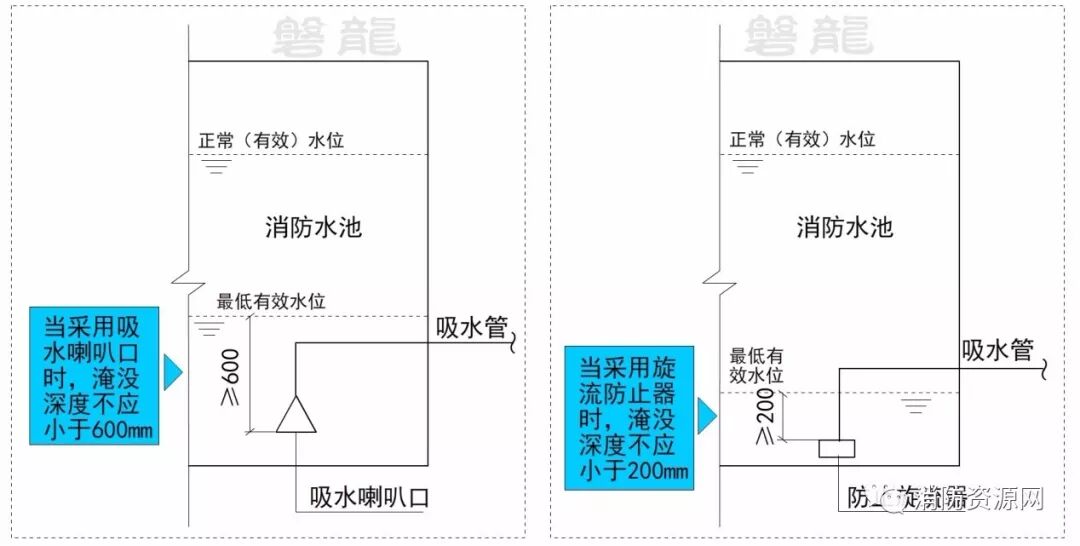 三、消防水泵吸水口的淹没深度应满足消防水泵在最低水位运行安全的要求。吸水管喇叭口在消防水池最低有效水位下的淹没深度应根据吸水喇叭口的水流速度和水力条件确定,但不应小于600mm,当采用旋流防止器时,淹没深度不应小于200mm;(5.1.13)