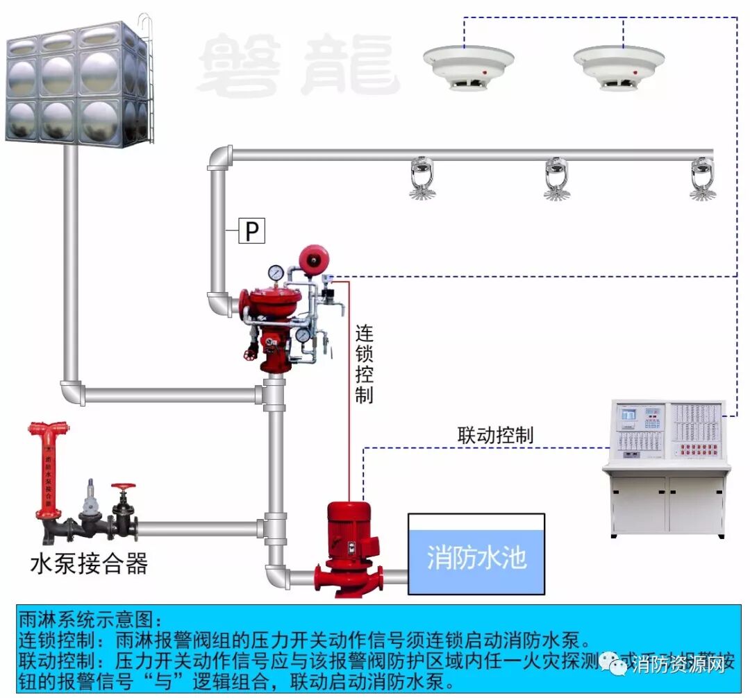 “连锁控制”和“联动控制”互为补充,不能替代。比如:在雨淋系统中,雨淋报警阀组的压力开关动作信号须连锁启动消防水泵(连锁启动);同时,压力开关动作信号应与该报警阀防护区域内任一火灾探测器或手动报警按钮的报警信号“与”逻辑组合,联动启动消防水泵(联动启动)。两者是冗余和保障关系,互不可少。