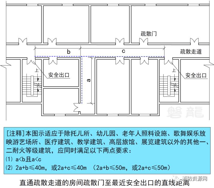 本图示是对丁字形走道疏散要求的适当从宽,却将高层医疗和教学建筑纳入(单多层却被排除),存在明显错误,假设当a接近为0时,高层医疗和教学建筑的b值和c值就接近40m,违反5.5.17的条文要求,同样,高层旅馆、展览建筑等等,也不成立。