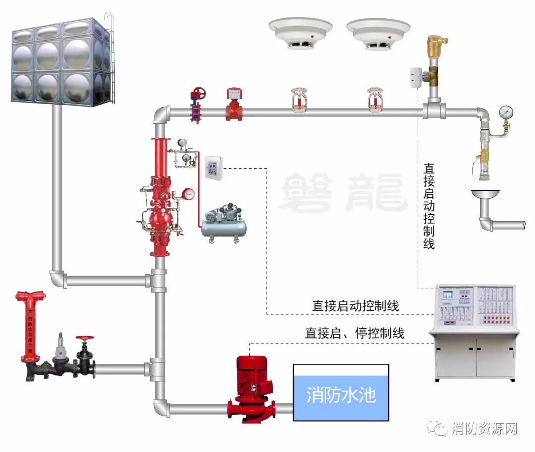 示例:如图所示的预作用系统中,预作用阀组的启动装置、快速排气阀入口前的电动阀以及消防泵组的启动柜,应分别采用专用线路连接至火灾报警联动控制器的多线控制盘,实现手动直接控制。