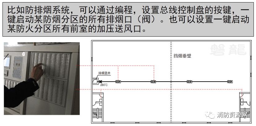 比如:对于防排烟系统,可以通过编程,设置总线控制盘的按键,一键启动某防烟分区的所有排烟口(阀)。也可以设置一键启动某防火分区所有前室的加压送风口。
