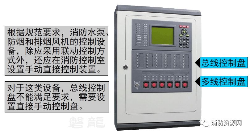 根据规范要求,消防水泵、防烟风机、排烟风机等重要设备,应具备在消防控制室(或值班室)手动直接控制的功能。这个功能总线控制盘不能满足要求,需要通过消防联动控制器的多线控制盘(也称为直接手动控制单元、直接手动控制盘)实现,多线控制盘的启\停按钮应通过专用线路与消防水泵、防烟风机、排烟风机的现场控制柜连接。